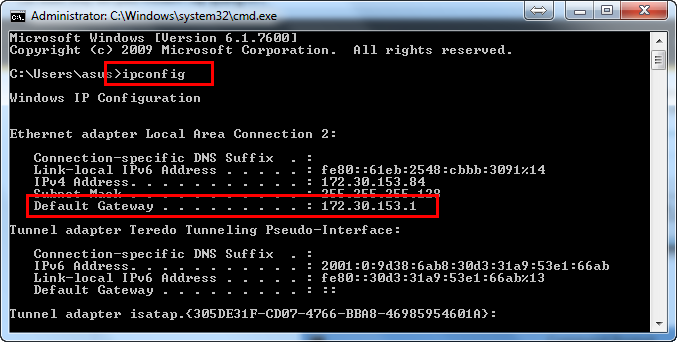 Dòng Default Gateway : 172.38.153.1 là địa chỉ ip của modem